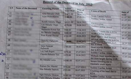 According to documents obtained from the Nepalese embassy in Doha, at least 44 workers died between 4 June and 8 August. More than half died of heart attacks, heart failure or workplace accidents.