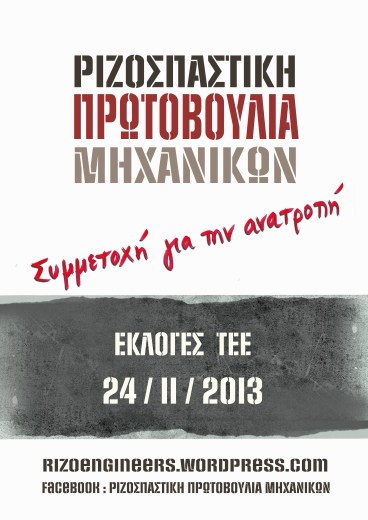 Σε αυτό το πλαίσιο και με σημείο καμπής τις επικείμενες εκλογές του ΤΕΕ στις 24/11/2013, καλούμε όλους τους συναδέλφους, να πλαισιώσουν την Ριζοσπαστική Πρωτοβουλία Μηχανικών.