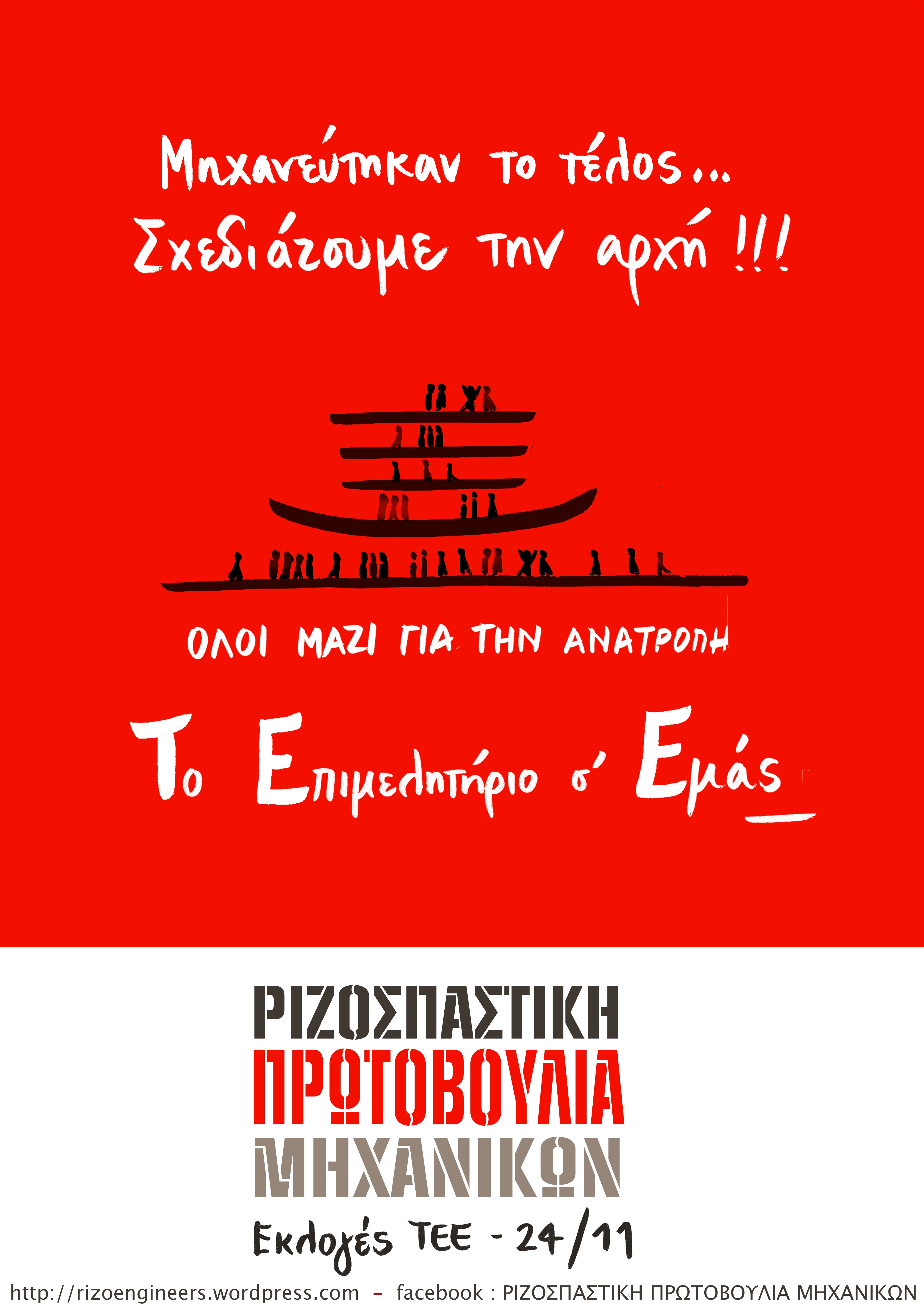 Ως εδώ η απαξίωση του ρόλου μας! Ως εδώ η αναξιοπρέπεια στην οποία οδηγείται ο κλάδος και οι ζωές μας! Ως εδώ η απάθεια και η ανοχή μας! Στις 24 Νοέμβρη κάνουμε την αρχή. Κλείνουμε το κεφάλαιο των διοικήσεων και των μηχανισμών ενός ΤΕΕ που μας άφησε απροστάτευτους από τις τραγικές επιπτώσεις της κρίσης, που δεν μας αντιμετώπισε ως επιστήμονες, δυναμικό απαραίτητο για την ανάκαμψη, αλλά λειτούργησε στην ουσία σαν κυβερνητικό όργανο με “πινελιές” ανούσιας διαμαρτυρίας και σαν διαπλεκόμενο κέντρο εξυπηρέτησης “ημετέρων”. Την ίδια στιγμή παρακολουθούσε αδιάφορα τους νέους συναδέλφους να μην μπορούν να γραφτούν στο ΤΕΕ και πολλοί να φεύγουν στο εξωτερικό, τους αυτοαπασχολούμενους να μένουν ανασφάλιστοι αδυνατώντας να πληρώσουν τις εισφορές τους, τους μισθωτούς με ή χωρίς μπλοκάκι να δέχονται απίστευτες περικοπές και τραγικές συνθήκες εργασίας, τα τεχνικά γραφεία να μην μπορούν να κρατήσουν το προσωπικό τους, τους περισσότερους συναδέλφους τυπικά να είναι ελεύθεροι επαγγελματίες αλλά ουσιαστικά άνεργοι χωρίς καν δικαίωμα για επίδομα ανεργίας. Θα επιτρέψουμε λοιπόν σε αυτούς να ξαναπάρουν τις τύχες του ΤΕΕ; Είτε με την ψήφο μας είτε (κι αυτό είναι το πιο κρίσιμο) με την αποχή μας;