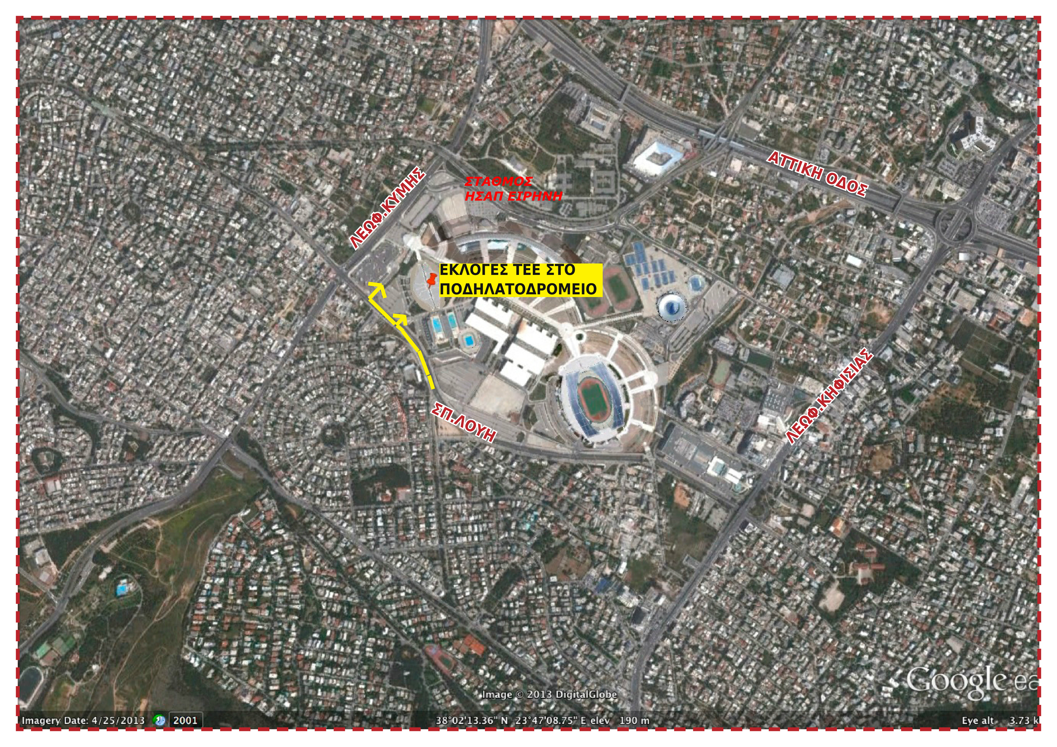 Στην ΑΘΗΝΑ Σε 60 εκλογικά τμήματα (με αριθμούς 1 έως 60) θα εγκατασταθούν όλα στο Ποδηλατοδρόμιο του Ολυμπιακού Αθλητικού Κέντρου Αθηνών (Ο.Α.Κ.Α.) «ΣΠΥΡΟΣ ΛΟΥΗΣ» – είσοδος από Λεωφ. Ολυμπιονίκη Σπύρου Λούη, Πύλη Ε’, Μαρούσι.