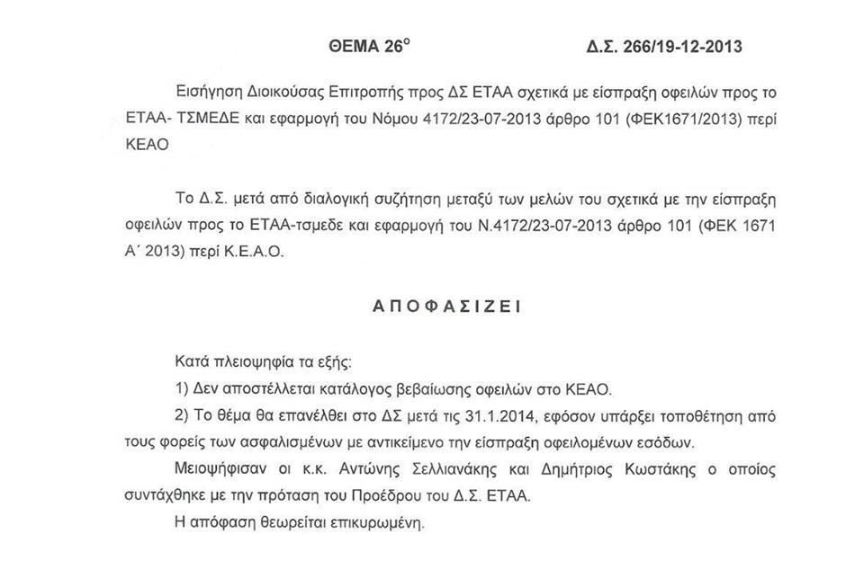 Μετά από πιέσεις της Ανοιχτής Συνέλευσης Μηχανικών δεν αποστέλλεται κατάλογος βεβαίωσης οφειλών στο Κέντρο Είσπραξης Ασφαλιστικών Οφειλών (ΚΕΑΟ) από το ΕΤΑΑ. Δείτε εδώ την από 19-12-2013 απόφαση του Δ.Σ. του ΕΤΑΑ: