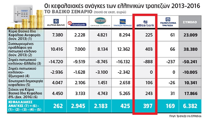 ΑΤΤΙΚΗΣ: Η κεφαλαιοποίηση της τράπεζας είναι μόλις 173 εκατ. ευρώ όταν οι κεφαλαιακές της ανάγκες καθορίστηκαν από την BlackRock στα 397 εκατ. ευρώ. Οι αναμενόμενες ζημιές πιστωτικού χαρτοφυλακίου είναι 888 εκατ. ευρώ και διαθέτει συσσωρευμένες προβλέψεις 403 εκατ. ευρώ και βασικά εποπτικά κεφάλαια 225 εκατ. ευρώ. Από εσωτερική δημιουργία κεφαλαίου προβλέπεται κεφαλαιακή ενίσχυση 106 εκατ. ευρώ.