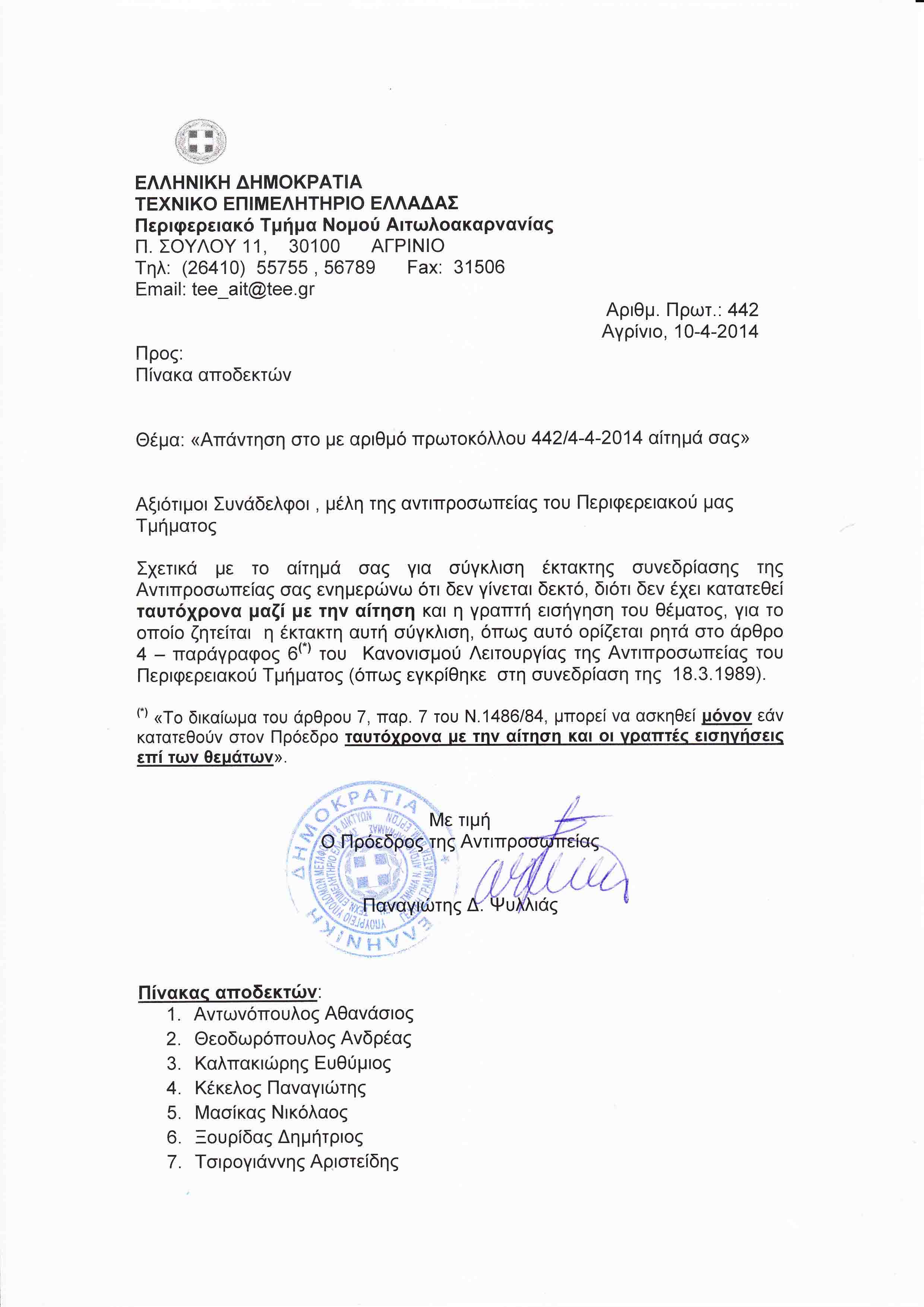 οι κάτωθι υπογράφοντες, μέλη της Αντιπροσωπείας του Π.Τ. Τ.Ε.Ε. Ν.Αιτωλ/νίας, σε καλούμε να προβείς στη σύγκλιση έκτακτης συνεδρίασης της Αντιπροσωπείας του Τμήματος, εντός δέκα (10) ημερών το αργότερο από την κατάθεση της παρούσας στην Υπηρεσία του Π.Τ. Τ.Ε.Ε. Ν.Αιτωλ/νίας, σύμφωνα με το άρθρο 7, παρ. 7 του Ν. 1486/84 και του Κανονισμού Λειτουργίας της Αντιπροσωπείας, με μοναδικό θέμα της Ημερήσιας Διάταξης την συζήτηση και λήψη απόφασης για την αντίδραση του Π.Τ. Τ.Ε.Ε. Ν.Αιτωλ/νίας στο ψηφισθέν με οριακή πλειοψηφία στις 30-3-2014 πολυνομοσχέδιο υπό τον ψευδεπίγραφο τίτλο «Μέτρα στήριξης και ανάπτυξης της ελληνικής οικονομίας στο πλαίσιο εφαρμογής του ν. 4046/2012 και άλλες διατάξεις» και τις, μεταξύ άλλων, τραγικές συνέπειες που κατά την άποψη της παράταξης «Ριζοσπαστική Πρωτοβουλία Μηχανικών – Συνεργασία για την Ανατροπή» επιφέρει στον κλάδο μας, δίνοντας έτσι τη χαριστική βολή στο επάγγελμα του διπλωματούχου μηχανικού.