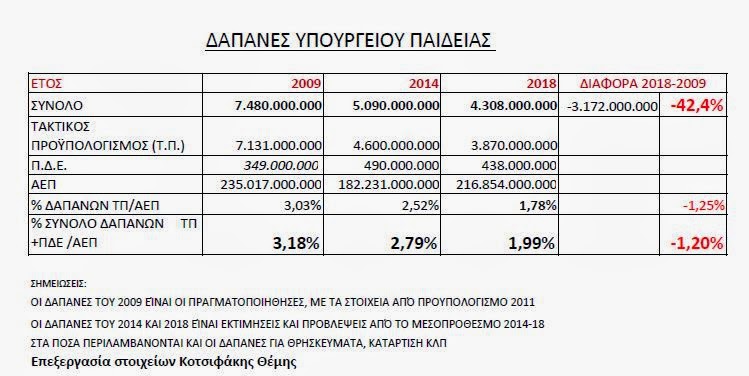 Οι δαπάνες του Υπουργείου Παιδείας το 2018 προβλέπονται μειωμένες κατά 42% σε σχέση με αυτές του 2008 και των ποσοστό των δαπανών από τακτικό προϋπολογισμό και πρόγραμμα δημοσίων επενδύσεων θα πέσει για πρώτη φορά στο παγκόσμιο αρνητικό ρεκόρ του 1,99% . Σημειώνουμε ότι ανάλογη ή μεγαλύτερη μείωση θα έχουν και τα κονδύλια από το νέο ΕΣΠΑ για δύο λόγους. Ο πρώτος είναι ότι το νέο ΕΣΠΑ συνολικά είναι σημαντικά μειωμένο σε σχέση με το Πρόγραμμα 2007-2014, αλλά επιπλέον το Επιχειρησιακό Πρόγραμμα του Υπουργείου Παιδείες βρίσκεται σε αναλογία με τους εθνικούς πόρους που αντιστοιχούν στις προβλεπόμενες για το υπουργείο δημόσιες επενδύσεις του 2018 που θα είναι μειωμένες κατά 52 εκατ. Ευρώ σε σχέση με το 2014.
