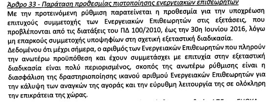 Στις λοιπές διατάξεις συμπεριλήφθηκε και η παράταση προθεσμίας πιστοποίησης ενεργειακών επιθεωρητών, μέχρι τις 30 Ιουνίου 2016.