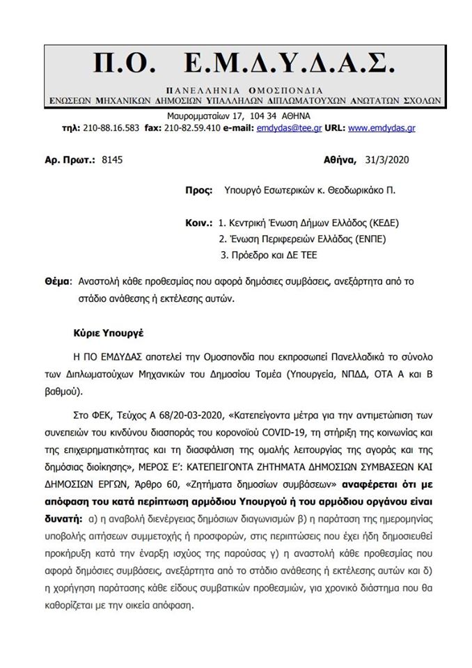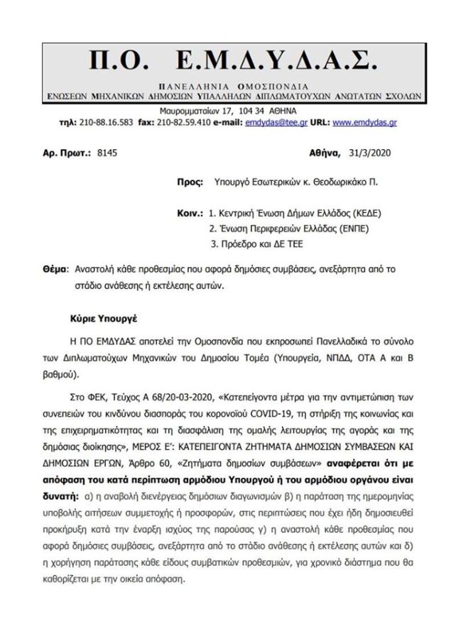 Αναστολή στις προθεσμίες των Δημοσίων Συμβάσεων ζητάει η ΕΜΔΥΔΑΣ