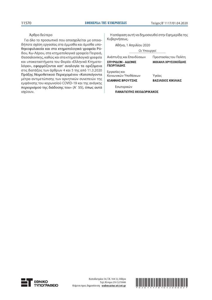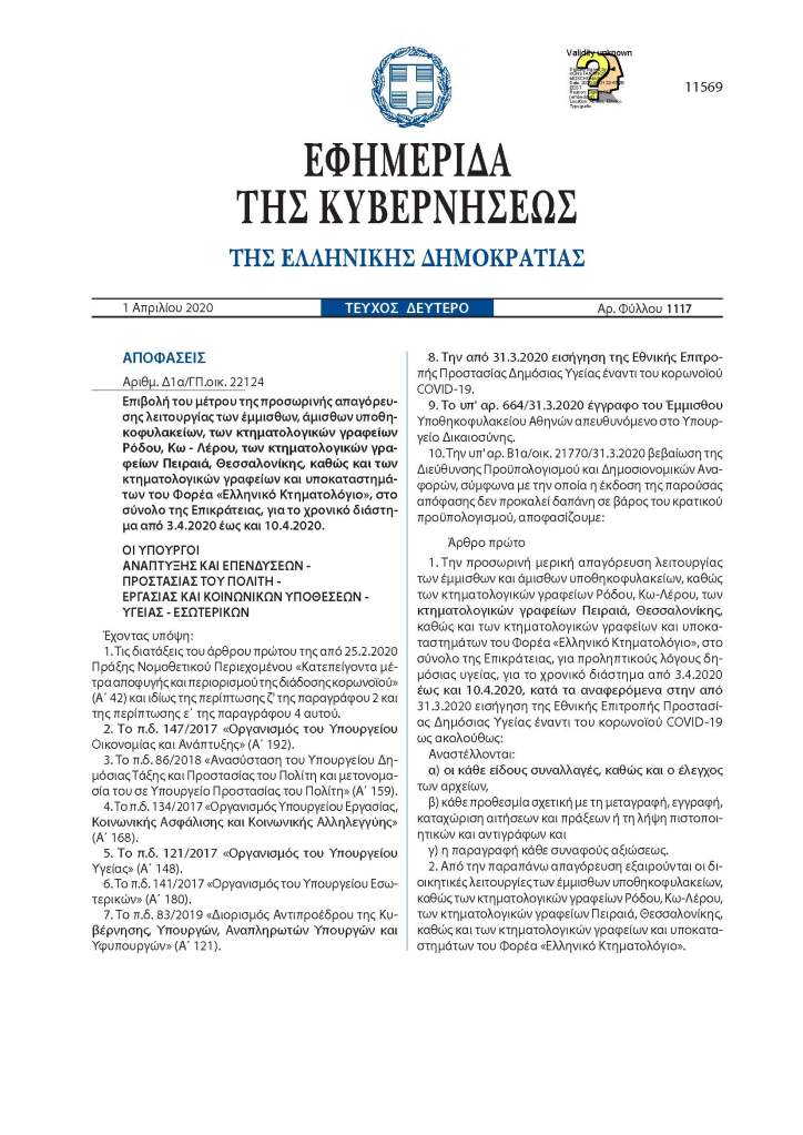 Βγήκε σε ΦΕΚ η απόφαση για την αναστολή λειτουργίας των υποθηκοφυλακείων και των κτηματολογικών γραφείων σε όλη την επικράτεια. Συγκεκριμένα, μέχρι τις 10/4/2020 αναστέλλονται οι συναλλαγές με το κοινό και ο έλεγχο των αρχείων, ενώ παρατείνεται και κάθε σχετική προθεσμία.