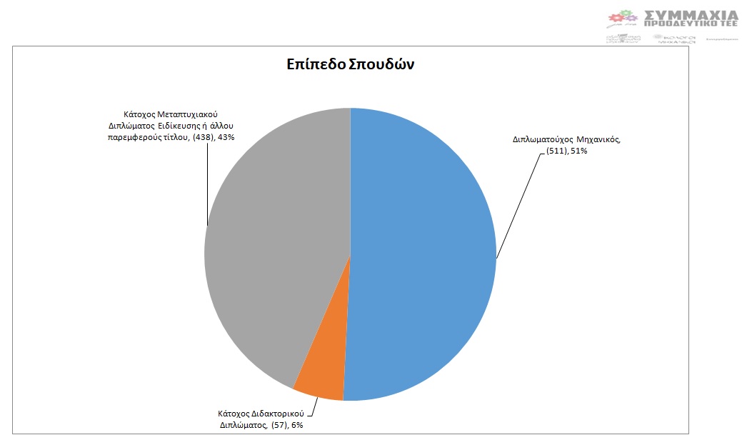 Στο ερωτηματολόγιο συμμετείχαν 1007 μηχανικοί. Στα γραφήματα παρακάτω αποτυπώνεται η ειδικότητα, το επίπεδο σπουδών, τα χρόνια εμπειρίας στην άσκηση του επαγγέλματος, ο τομέας επαγγελματικής δραστηριότητας και το ποσοστό επαγγελματικής ενασχόλησης σε χώρες του εξωτερικού των συμμετεχόντων μηχανικών.