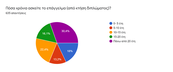 Στο ερωτηματολόγιο συμμετείχαν αυτοαπασχολούμενοι (82,7%) και υπάλληλοι (17,3%), ιδιωτικοί, δημόσιοι ή και με Δελτίο Παροχής Υπηρεσιών. Οι συμμετέχοντες ήταν νέοι και νέες στο επάγγελμα (14,28%), έμπειροι μηχανικοί (10-15 έτη – 22,4%) και ιδιαίτερα έμπειροι καθώς ένας στους δύο έχει εμπειρία άνω των 15 ετών (46,5%).