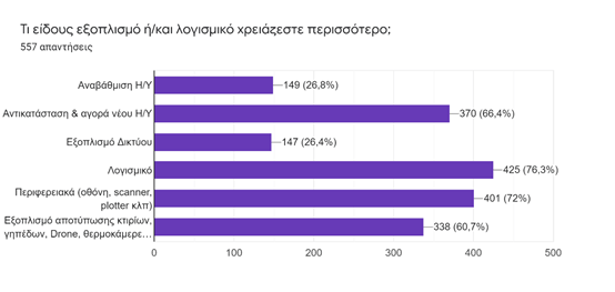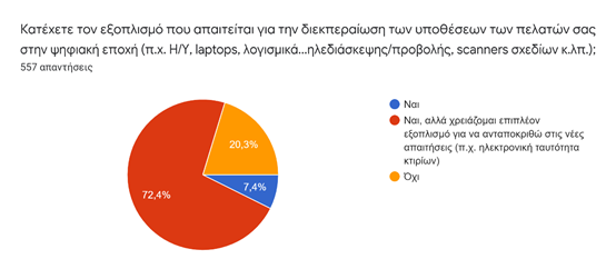 Για να ανταποκριθεί στις νέες απαιτήσεις, το 72,4%, δήλωσε ότι χρειάζεται επιπλέον ψηφιακό εξοπλισμό, ενώ το 20,3%, δήλωσε ότι κατέχει εντελώς ανεπαρκή εξοπλισμό, για να ανταποκριθεί στην διεκπεραίωση των υποθέσεων των πελατών του στην ψηφιακή εποχή. Οι επαρκώς εξοπλισμένοι, ανέρχονται στο 7,4%. Οι απαιτήσεις αυτές, αναλύονται ως εξής: To 93,2%, δήλωσε ότι χρειάζεται αντικατάσταση και αγορά νέου Η/Υ ή αναβάθμιση του υπάρχοντος, ενώ το 76,3% χρειάζεται νέο πρόσθετο λογισμικό. Το 72%, χρειάζεται νέο πρόσθετο εξοπλισμό, ενώ το 26,4%, χρειάζεται εξοπλισμό διαδικτύου.