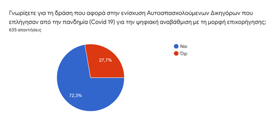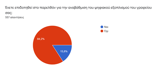 Το 66% των συμμετεχόντων πιστεύει ότι η πανδημία συνέβαλε στον ψηφιακό εκσυγχρονισμό των διαδικασιών του κράτους σε ό,τι σχετίζεται με την εργασία του μηχανικού, ενώ το υπόλοιπο 34%, δεν συμφωνεί με αυτή την διατύπωση. Ο εκσυγχρονισμός αυτός, δημιούργησε αυξημένες υποχρεώσεις για καλύτερη οργάνωση της εργασίας, όσο και αυξημένες ανάγκες εξοπλισμού. Όμως, διαχρονικά η στήριξη από πλευράς κράτους, υπήρξε σχεδόν ανύπαρκτη, καθώς το 84,2% δηλώνει ότι δεν έχει λάβει ποτέ οποιασδήποτε μορφής στήριξη για την αναβάθμιση του ψηφιακού εξοπλισμού του γραφείου του. Από το υπόλοιπο 15,8%, που έλαβε στήριξη κάποτε στο παρελθόν, το 85,2% ασκεί το επάγγελμα περισσότερο από μια δεκαετία!