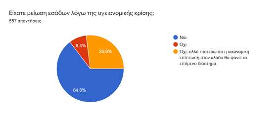 Το 64,6% δήλωσε, ότι μειώθηκαν τα εισοδήματά του κατά τη διάρκεια της πανδημίας, ενώ το 35,4% δεν συμφωνεί με αυτή την διατύπωση. Από το σύνολό των συμμετεχόντων όμως η συντριπτική πλειοψηφία (76%), επισημαίνει ότι οι αρνητικές επιπτώσεις της πανδημίας, θα φανούν στο επόμενο χρονικό διάστημα. Η πανδημία συνέβαλε σημαντικά στην μείωση των εισοδημάτων κυρίως των αυταπασχολούμενων μηχανικών.