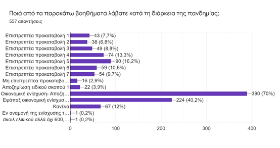 Η ενίσχυση του κράτους προς το κλάδο, είναι θλιβερή, καθώς ενώ οι επτά στους δέκα (70,4%), έλαβαν την «σκόϊλ ελικίκου» ενίσχυση των 600 ευρώ, η επόμενη ενίσχυση των 400 ευρώ (εφάπαξ ενίσχυση από τον ειδικό λογαριασμό), έφτασε στις τσέπες, μόνο του 40,2%. Το 12% των ερωτηθέντων, δεν έλαβε καμία ενίσχυση. Διαφαίνεται ότι ο κλάδος είχε την μικρότερη στήριξη από πλευράς κράτους.