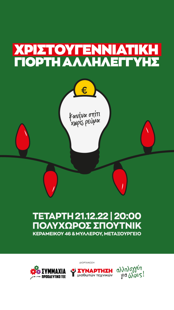 Η ΣΥΜΜΑΧΙΑ για ένα ΠΡΟΟΔΕΥΤΙΚΟ ΤΕΕ, η ΣΥΝΑΡΤΗΣΗ ΜΙΣΘΩΤΩΝ ΤΕΧΝΙΚΩΝ και η κοινωνική Πρωτοβουλία ΑΛΛΗΛΕΓΓΥΗ ΓΙΑ ΟΛΟΥΣ συνδιοργανώνουν την Χριστουγεννιάτικη Γιορτή Αλληλεγγύης με σύνθημα «Kανένα σπίτι χωρίς ρεύμα«. Η Γιορτή θα πραγματοποιηθεί στον Πολυχώρο Σπούτνικ (Κεραμεικού & Μυλλέρου, πλατεία Αβδή, Μεταξουργείο) την Τετάρτη 21/12/2022 στις 20:00.