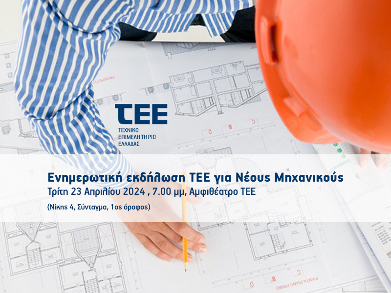 Το Τεχνικό Επιμελητήριο Ελλάδας διοργανώνει ενημερωτική εκδήλωση για τους νέους συναδέλφους την Τρίτη 23 Απριλίου 2024 στις 7.00μμ στο αμφιθέατρο του ΤΕΕ (Νίκης 4, Σύνταγμα, 1ος όροφος) με δυνατότητα και διαδικτυακής παρακολούθησης από το κανάλι του ΤΕΕ στο YouTube.